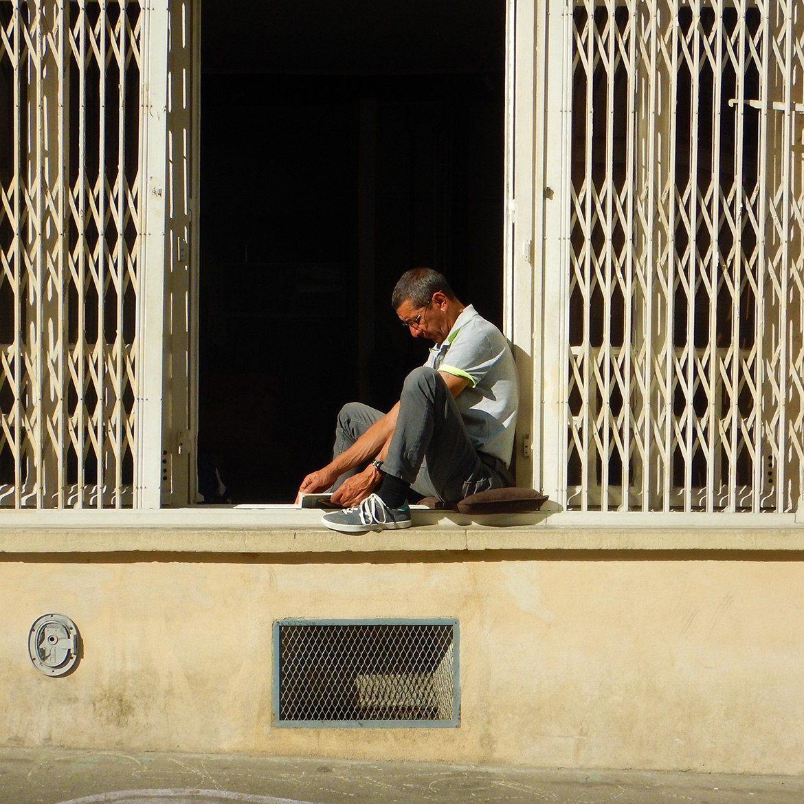 004 LGV264 2015-05-30 france paris montmartrecandid portrait toonie book reader manThe reader. Rue Lepic, Montmartre, 18th Arrondissment, Paris. May 2015